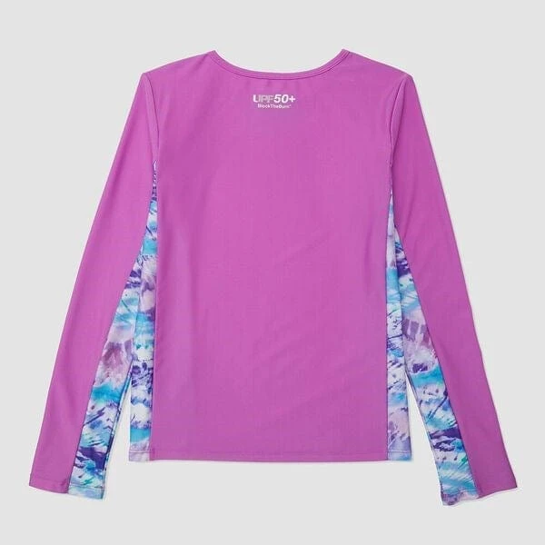 Prepare young swimmers for fun in the water with a durable rashguard. This fitted top features printed long sleeves and side panels. UPF rated, so she can splash all day.