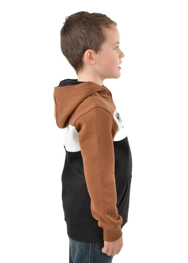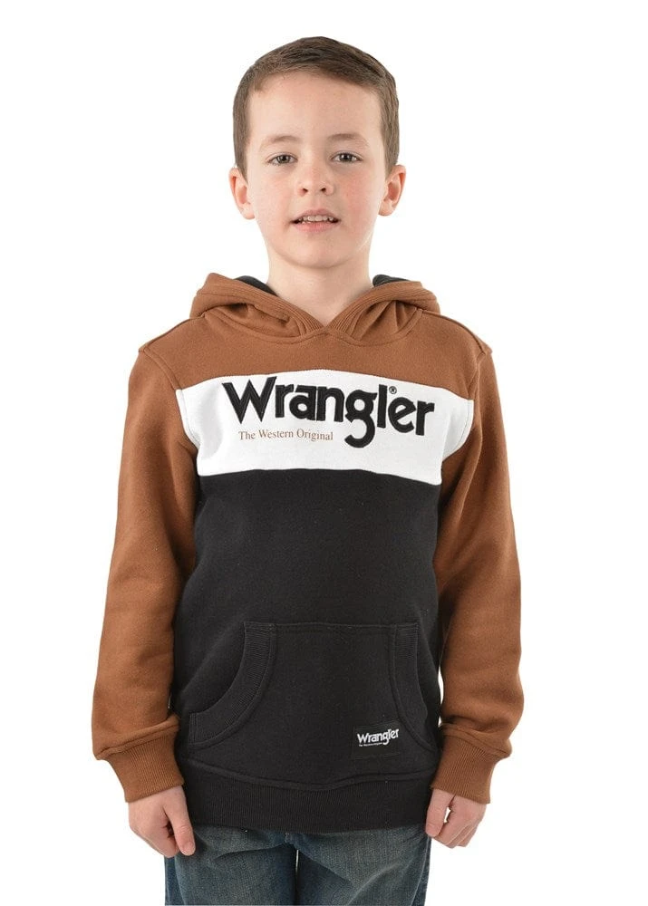 Heavyweight brushed fleece pullover, cut n sew contrast paneling, large front feature Wrangler iconic logo applique and print, contrast hood lining, front kanga patch pocket, rib trim hem and cuffs