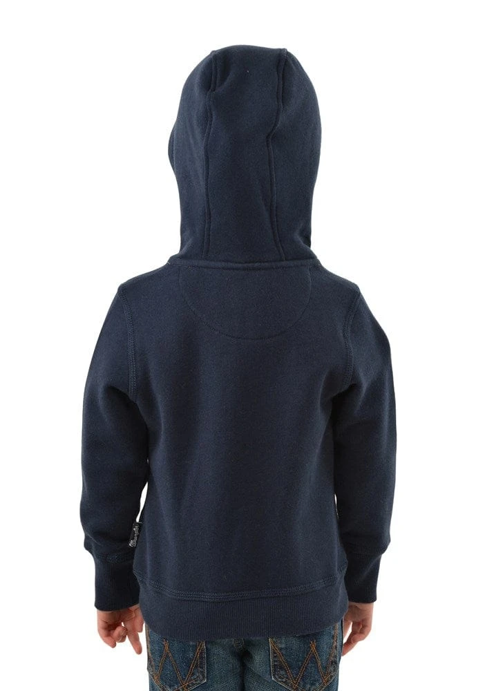 Heavyweight brushed fleece pullover, large front feature Wrangler puff print and embroidery, Wrangler iconic logo herringbone tape on inside back neck, rib trim hem and cuffs